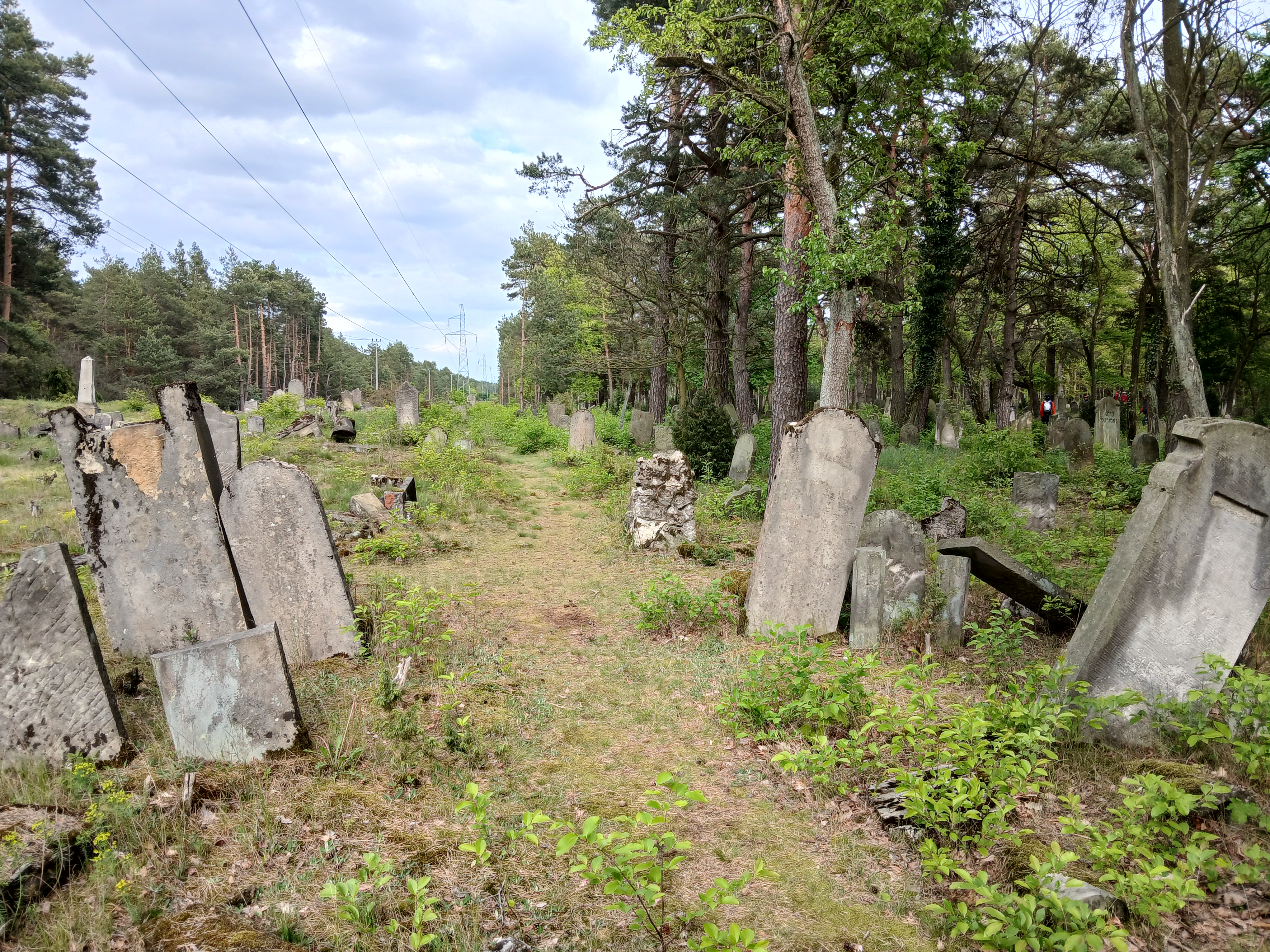 Pochylone i poprzewracane macewy na cmantarzu żydowskim