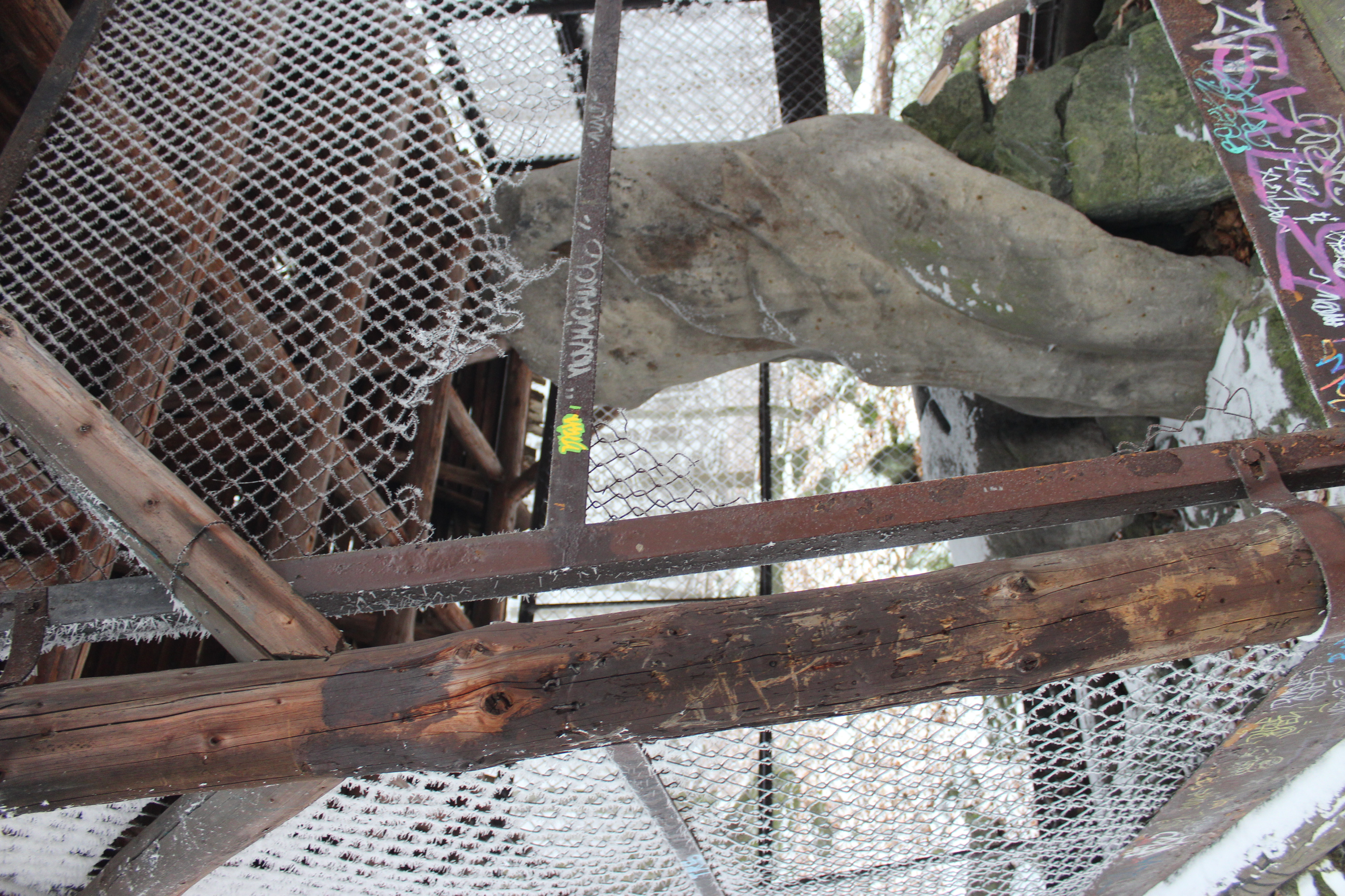Postać z rybą i niedźwiadek, trudno o dobre ujęcie bo rzeźby otacza siatka